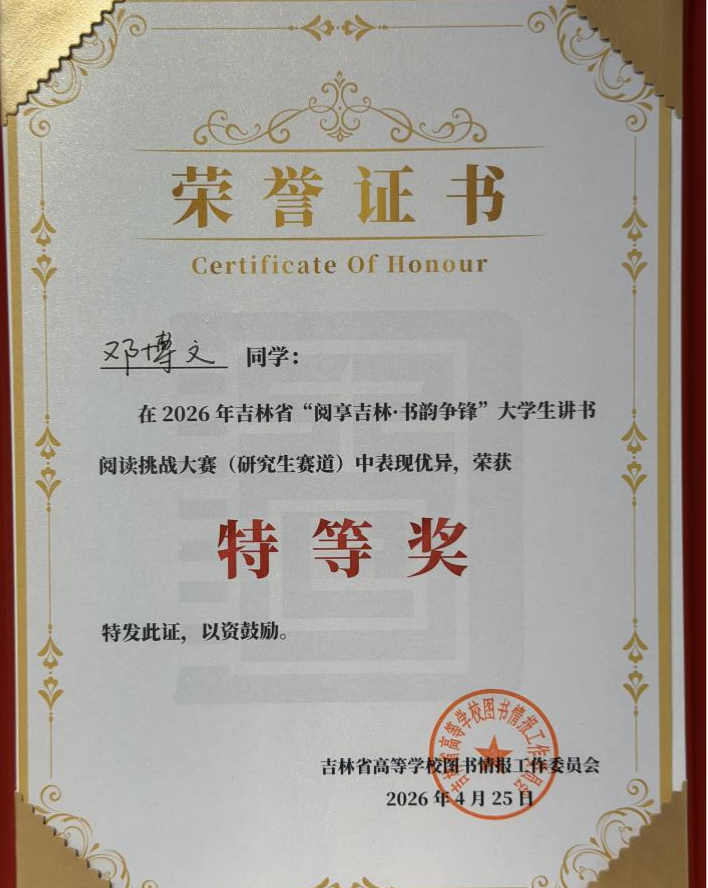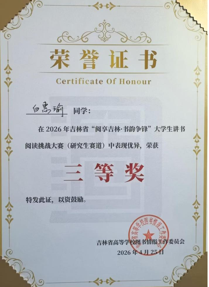 4月25日,2026年吉林省“阅享吉林·书韵争锋”大学生讲书阅读挑战大赛总决赛在吉林大学落下帷幕。3044AM永利集团研究生在全省各高校参赛选手中脱颖而出,喜获佳绩。