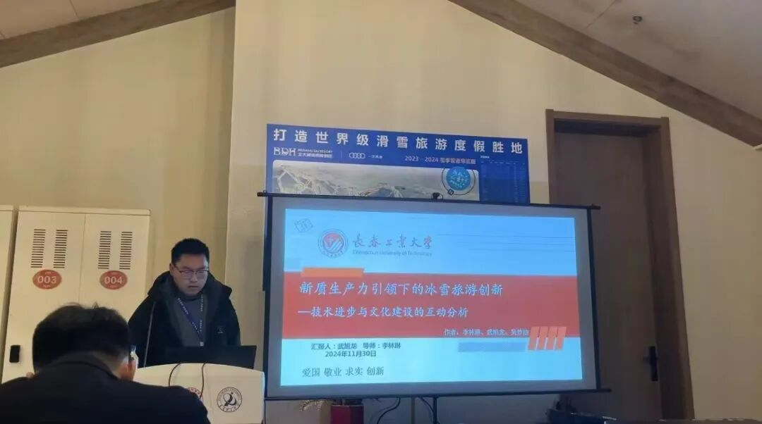 我院2024级思想政治教育专业研究生武旭龙和吴梦洁同学提交的学术论文《新质生产力引领下的冰雪旅游创新 ——技术进步与文化建设的互动分析》经组委会评议,通过评审,并受邀在“新质生产力赋能冰雪产业”分论坛上做学术分享。武旭龙围绕“新质生产力”的深刻内涵和党的二十届三中全会精神指引,详细论述了“新质生产力”助力吉林省冰雪经济与冰雪文化发展的实践路径选择。吉林大学博士生导师裘鹏教授对武旭龙的汇报做了专业点评,充分肯定了论文成果,并提出了具有建设性和前瞻性的建议。